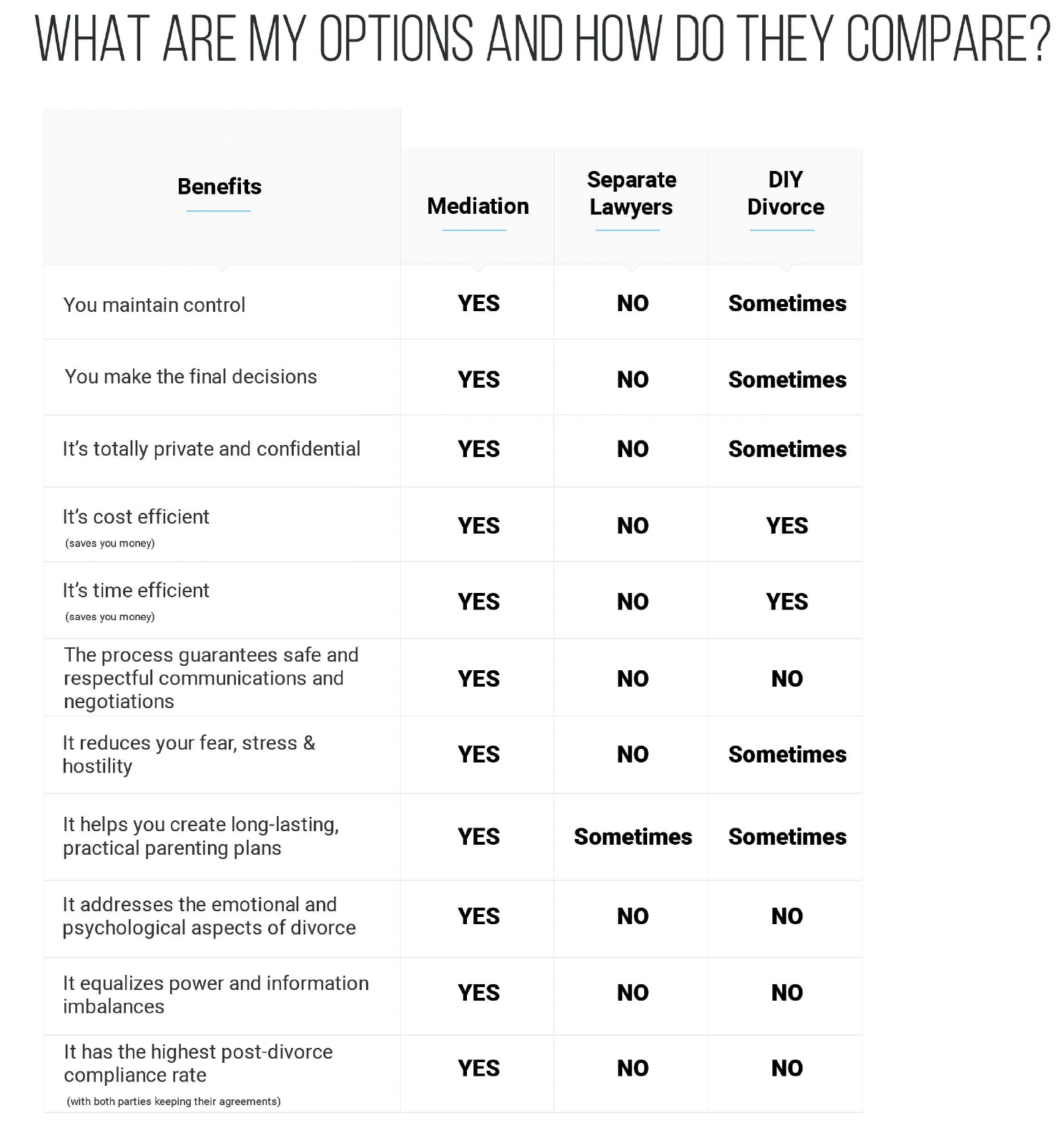 In mediation, divorcing couples decide what’s best for them, rather than surrendering control to lawyers or a judge. They reach agreements based on their particular relationship and circumstances. This takes place in a collaborative environment, significantly less stressful than the adversarial, win-lose procedures involved in using two separate adversarial lawyers.